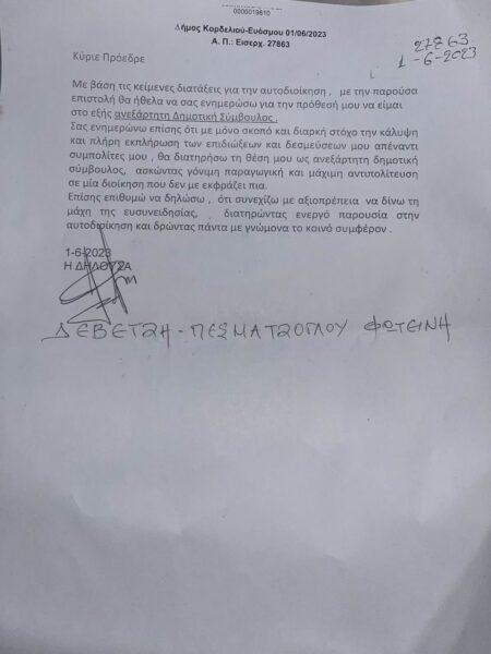 Συγκεκριμένα η κ. Δεβετζή γράφει στην επιστολή της: «Θα διατηρήσω τη θέση μου ως ανεξάρτητη δημοτική σύμβουλος, ασκώντας γόνιμη παραγωγική και μάχιμη αντιπολίτευση σε μια διοίκηση που δε με εκφράζει πια».