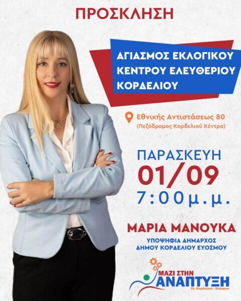 Την Παρασκευή 1 Σεπτεμβρίου στις 19:00 η υποψήφια δήμαρχος του Δήμου Κορδελιού – Ευόσμου και επικεφαλής της παράταξης «Μαζί στην Ανάπτυξη του Ελ. Κορδελιού – Ευόσμου», Μαρία Μανούκα απευθύνει ανοιχτό κάλεσμα σε όλες και όλους για τον αγιασμό του εκλογικού κέντρου στο Ελ. Κορδελιό.