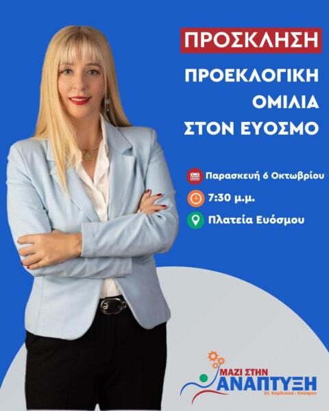 Την Παρασκευή 6 Οκτωβρίου 2023, στις 19.30, η υποψήφια δήμαρχος του δήμου Κορδελιού-Ευόσμου, Μαρία Μανούκα, θα πραγματοποιήσει ανοιχτή προεκλογική ομιλία στην πλατεία Δημαρχείου στον Εύοσμο.