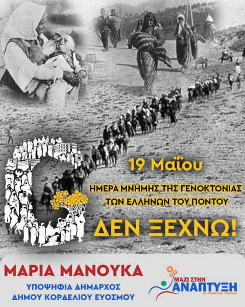 Με αφορμή τη σημερινή Ημέρα Μνήμης της Γενοκτονίας του Ποντιακού Ελληνισμού, η επικεφαλής του συνδυασμού «Μαζί στην Ανάπτυξη του Ελ. Κορδελιού – Ευόσμου» και υποψήφια Δήμαρχος, Μαρία Μανούκα, έκανε την ακόλουθη δήλωση: