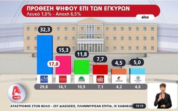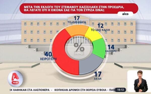 Πάντως η Νέα Δημοκρατία κρατάει μια διαφορά 17 μονάδων από τον ΣΥΡΙΖΑ σύμφωνα πάντα με την δημοσκόπηση της Alco ενώ οι πολίτες ζητούν από τον Στέφανο Κασσελάκη να στραφεί προς το κέντρο.
