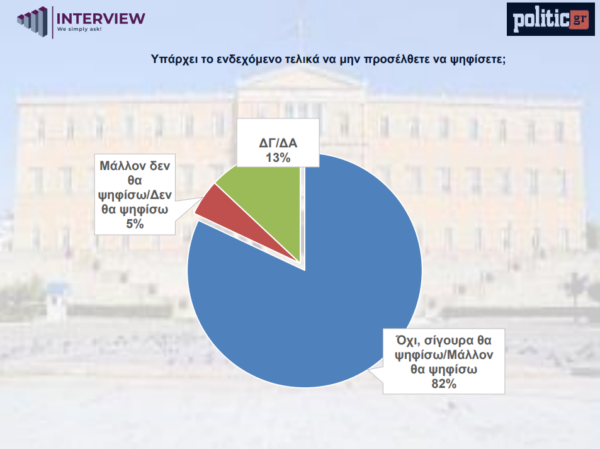 Παρά τη ρευστότητα, η συντριπτική πλειονότητα των αναποφάσιστων δηλώνει ότι θα προσέλθει στην κάλπη. Συγκεκριμένα, το 82% απαντά «σίγουρα» ή «μάλλον θα ψηφίσω». Μόνο ένα 5% αναφέρει ότι «μάλλον δεν θα ψηφίσει» ή «δεν θα ψηφίσει»