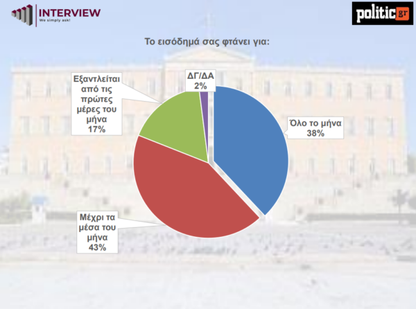 Η εικόνα επιβαρύνεται περαιτέρω όταν εξεταστεί η αυτοαξιολόγηση των πολιτών για την οικονομική τους κατάσταση. Το 43% δηλώνει ότι τα χρήματα φτάνουν μέχρι τα μέσα του μήνα, ενώ ένα 17% απαντά ότι εξαντλείται ήδη από τις πρώτες ημέρες. Μόνο το 38% αναφέρει ότι το εισόδημά του επαρκεί για ολόκληρο τον μήνα.
