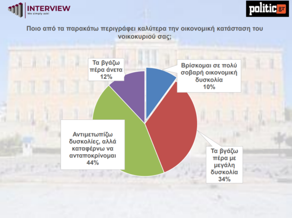 Το 10% των πολιτών δηλώνει ότι βρίσκεται σε πολύ σοβαρή οικονομική πίεση, ενώ ένα 34% αναφέρει ότι “τα βγάζει πέρα με μεγάλη δυσκολία”. Επιπλέον, το 44% αντιμετωπίζει οικονομικές δυσκολίες αλλά καταφέρνει να ανταποκρίνεται. Αντίθετα, μόλις το 12% των συμμετεχόντων δηλώνει ότι τα βγάζει πέρα άνετα.