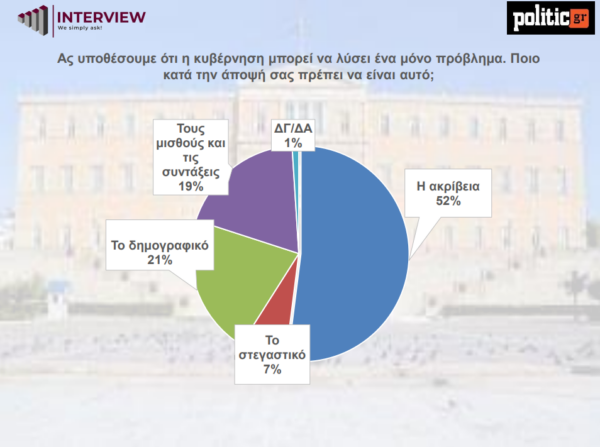 Στο ερώτημα για το αν η χώρα κινείται στη σωστή ή στη λάθος κατεύθυνση, το 67% απαντά ότι βρίσκεται σε λάθος τροχιά, ενώ το 30% δηλώνει ότι κινείται προς τη σωστή κατεύθυνση μάλιστα, σε ένα υποθετικό σενάριο όπου η κυβέρνηση μπορεί να λύσει μόνο ένα πρόβλημα, το 52% επιλέγει την ακρίβεια ως απόλυτη προτεραιότητα. Ακολουθούν το δημογραφικό (21%), οι μισθοί και συντάξεις (19%) και το στεγαστικό (7%).