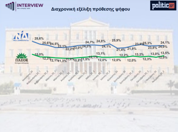 Στην πρόθεση ψήφου, η Νέα Δημοκρατία συγκεντρώνει 24,1% και παραμένει πρώτη δύναμη, χωρίς εμφανείς αποκλίσεις σε σχέση με προηγούμενες μετρήσεις. Το ΠΑΣΟΚ ανεβαίνει στο 13,5%, επιβεβαιώνοντας μια σταθερή παρουσία στη δεύτερη θέση. Το στοιχείο αυτό, σε συνδυασμό με τη διαχρονική πορεία των δύο κομμάτων μέσα στο 2025, ενισχύει την εικόνα σταθεροποίησης ενός διπολικού σκηνικού.