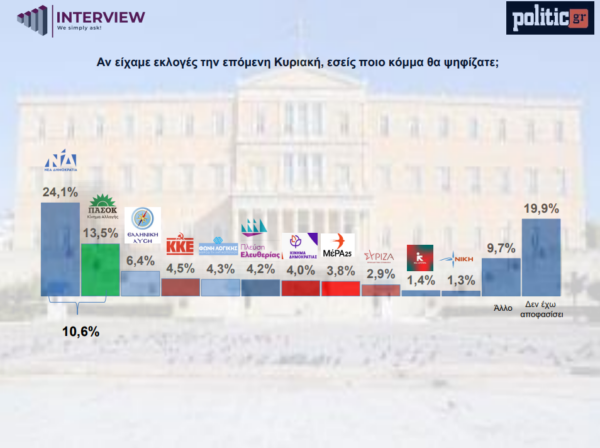 Σημαντικό εύρημα είναι η διεύρυνση του ποσοστού των αναποφάσιστων, οι οποίοι πλέον κινούνται στο όριο του 20% και διαμορφώνουν σημαντικό περιθώριο μεταβολών.