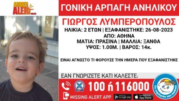 Το Χαμόγελο του Παιδιού ενεργοποίησε τον μηχανισμό Amber Alert για τον δίχρονο Γιώργο Λυμπερόπουλο, κατόπιν εισαγγελικής εντολής, καθώς «υπάρχουν ενδείξεις που υποδεικνύουν ότι πιθανόν η ζωή του παιδιού βρίσκεται σε κίνδυνο».