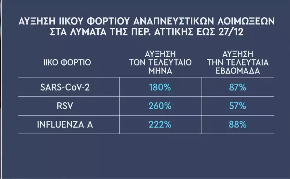 Μεγάλη είναι η αύξηση των κρουσμάτων κορωνοϊού και γρίπης τις τελευταίες εβδομάδες, με την ανάλυση των λυμάτων να αποτυπώνει και υψηλά νούμερα στη χρήση ναρκωτικών ουσιών κατά τη διάρκεια των εορτών.