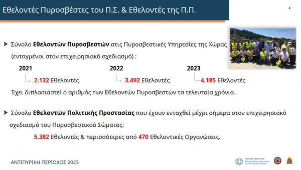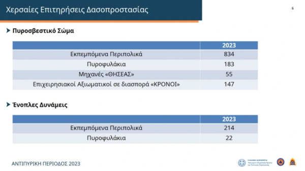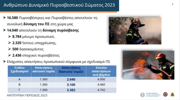Συνολικά, φέτος 14.040 πυροσβέστες αποτελούν τη δύναμη πυρόσβεσης. Η Πυροσβεστική διαθέτει στόλο 3.654 οχημάτων (έναντι 3.410 το 2022) και 89 εναέρια μέσα (έναντι 83 το 2022).