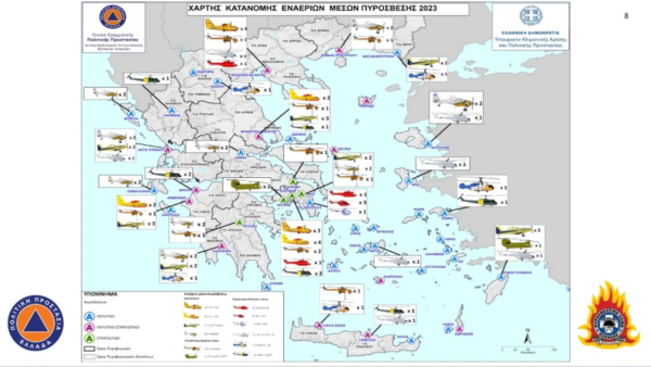 Εντός του σχεδίου για την αντιπυρική περίοδο είναι και ο χάρτης με την κατανομή των εναέριων μέσων της Πυροσβεστικής. Πρόκειται για τα αεροσκάφη και τα ελικόπτερα τα οποία θα είναι σε ετοιμότητα για να επιχειρήσουν στην κατάσβεση πυρκαγιών.