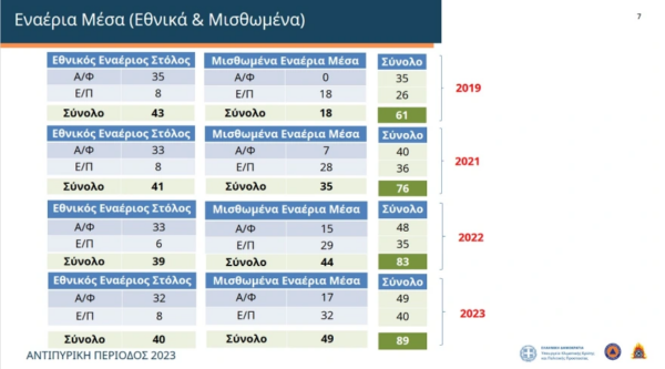 Όπως αναφέρεται και στον σχεδιασμό το 2023 τα εναέρια μέσα που θα έχει στη διάθεσή της η Πυροσβεστική είναι περισσότερα 89, έναντι 83 το 2022 και μόλις 61 το 2019.