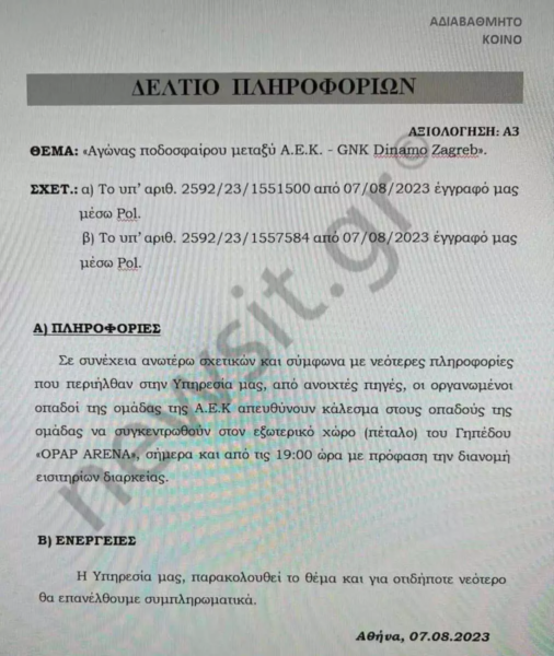 Την επόμενη μέρα και ειδικότερα στις 7 Αυγούστου 2023, σε δεύτερο Δελτίο Πληροφοριών με θέμα «Αξιολόγηση: Α3. Αγώνας ποδοσφαίρου μεταξύ ΑΕΚ – GΝΚ Dinamo Zagreb και επισυναπτόμενα έγγραφα από το σύστημα POL. με αριθμούς το υπ’ 2592 / 23 / 155 1500 από 7/8/ 2023 και 2592 / 23 / 155 7584 από 7/8/ 2023, που έχει στη διάθεση του το NewsIT, αναφέρονται τα εξής: «Σε συνέχεια ανωτέρω σχετικών και σύμφωνα με νεότερες πληροφορίες που περιήλθαν στην υπηρεσία μας από ανοιχτές πηγές, οι οργανωμένοι οπαδοί της ομάδας της ΑΕΚ , απευθύνουν κάλεσμα στους οπαδούς της ομάδας να συγκεντρωθούν στον εξωτερικό χώρο – πέταλο – του γηπέδου OPAP ARENA σήμερα και από τις 19:00 ώρα με πρόφαση την διανομή εισιτηρίων διαρκείας».