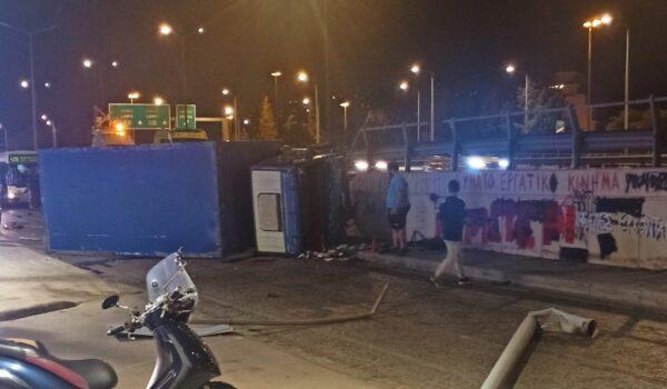 Σύμφωνα με την Τροχαία, έγινε ανατροπή φορτηγού κατά την οποία τραυματίστηκε ελαφρά ο οδηγός του.