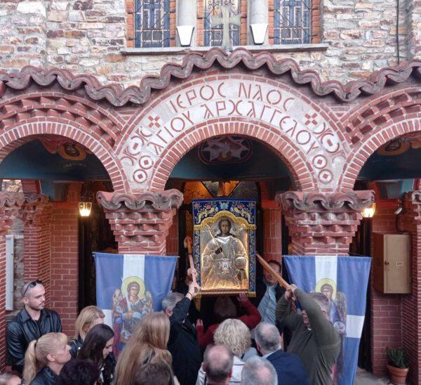 Το εντυπωσιακό έλατο ύψους 13 μέτρων με πλούσια κλαδιά φωταγωγήθηκε σήμερα στο πλαίσιο εκδήλωσης που παραδοσιακά γίνεται την παραμονή της γιορτής του πολιούχου και προστάτη του χωριού Αρχαγγέλου Μιχαήλ μετά τον μέγα εσπερινό.