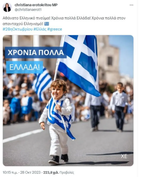 Χαμός με την ανάρτηση Κύπριας βουλευτή: Ευχήθηκε χρόνια πολλά στην Ελλάδα με παιδάκι από τεχνητή νοημοσύνη και λάθος σημαία