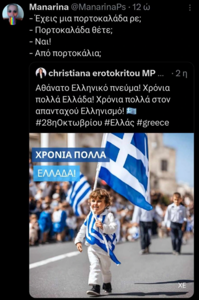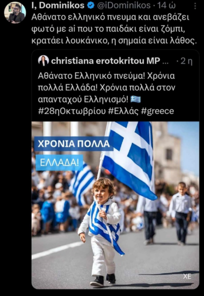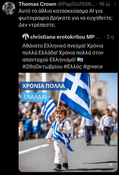 Οι χρήστες του X δεν άφησαν ασχολίαστη τη συγκεκριμένη φωτογραφία γράφοντας σχόλια όπως «Για όνομα», «ο Χριστός και η Παναγία!» «γιατί να χρησιμοποιήσεις εικόνα από τεχνητή νοημοσύνη; Ψάξε στο Google. Δεν υπάρχουν σχόλια για το πόσο ντροπιαστικό είναι αυτό», «αθάνατο;», «δεν είδε τη σημαία και το υποτιθέμενο παιδί πώς είναι;».
