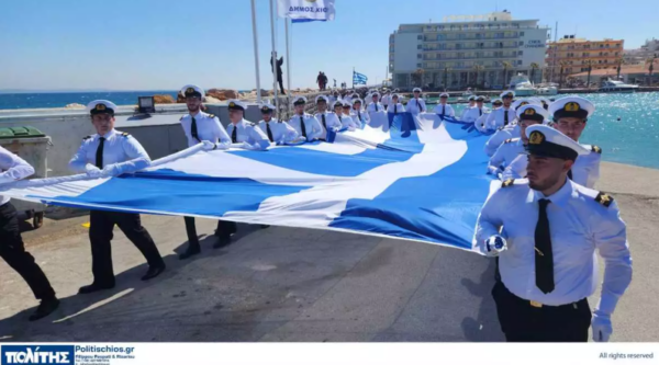 Η εντυπωσιακή ελληνική σημαία μεταφέρθηκε στο ιστό της στο λιμάνι με πομπή από τους σπουδαστές της Ακαδημίας Εμπορικού Ναυτικού Μηχανικών Χίου υπό τα εμβατήρια της φιλαρμονικής του Δήμου, ενώ τιμές απέδωσε στρατιωτικό άγημα της 96 ΑΔΤΕ «Χίος».