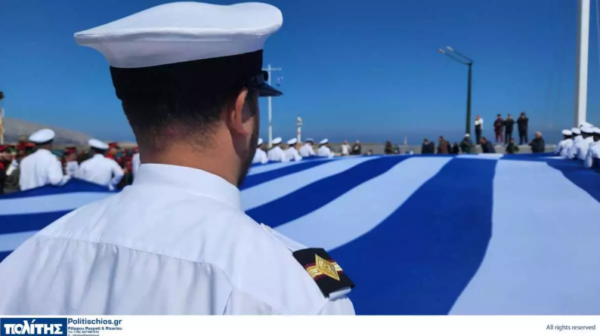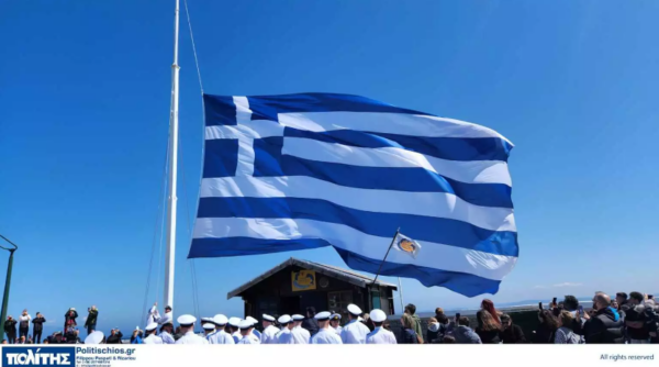 Εντυπωσιάζει η τεράστια ελληνική σημαία, που υψώθηκε στο λιμάνι του νησιού