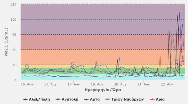 Με τις μεγάλες πυρκαγιές σε Έβρο, Βοιωτία, Εύβοια και Αττική να είναι σε εξέλιξη μεταξύ άλλων, σταθμοί της ΠΑΝΑΚΕΙΑ κατέγραψαν την Τρίτη υψηλές συγκεντρώσεις μικροσωματιδίων ακόμα και εκατοντάδες χιλιόμετρα μακριά από τα πύρινα μέτωπα.