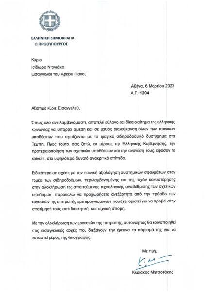 Όπως όλοι αντιλαμβανόμαστε, αποτελεί εύλογο και δίκαιο αίτημα της ελληνικής κοινωνίας να υπάρξει άμεση και σε βάθος διαλεύκανση όλων των ποινικών υποθέσεων που σχετίζονται με το τραγικό σιδηροδρομικό δυστύχημα στα Τέμπη. Προς τούτο σας ζητώ, εκ μέρους της Ελληνικής Κυβέρνησης, την προτεραιοποίηση των σχετικών υποθέσεων και την ανάθεσή τους, εφόσον το κρίνετε στο υψηλότερο ανακριτικό επίπεδο.