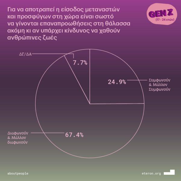 - – 1 στα 4 άτομα της Gen Z συμφωνεί ότι για να αποτραπεί η είσοδος μεταναστών και προσφύγων στη χώρα, είναι σωστό να γίνονται επαναπροωθήσεις στη θάλασσα ακόμη κι αν υπάρχει κίνδυνος να χαθούν ανθρώπινες ζωές.