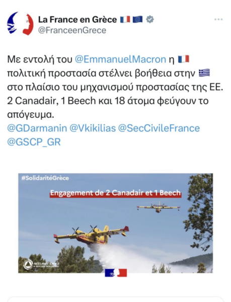 Ο ΥΠΕΣ της Γαλλίας Ζεράρ Νταρμανέν γνωστοποίησε επίσης ότι εκτός από τα Canadair θα σταλθούν ένα αναγνωριστικό αεροπλάνο αλλά και δεκαοχτώ πυροσβέστες.