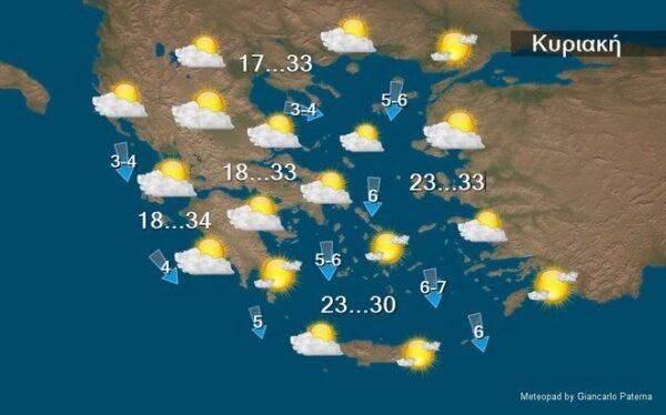 Την Κυριακή (3/9) σε όλη τη χώρα προβλέπεται γενικά αίθριος καιρός με λίγες νεφώσεις στην ανατολική χώρα οι οποίες παροδικά θα είναι αυξημένες στη βόρεια Κρήτη, όπου ενδέχεται να σημειωθούν ασθενείς τοπικές βροχές. Τις μεσημβρινές και απογευματινές ώρες στα ηπειρωτικά θα αναπτυχθούν τοπικές νεφώσεις και ενδέχεται να σημειωθούν μεμονωμένοι όμβροι στα ορεινά.