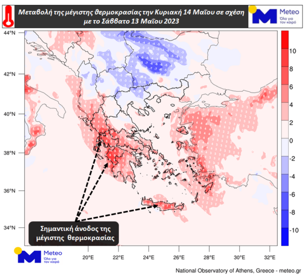 Χάρτης 1. Η μεταβολή της μέγιστης θερμοκρασίας την Κυριακή 14/05 σε σχέση με το Σάββατο 13/05