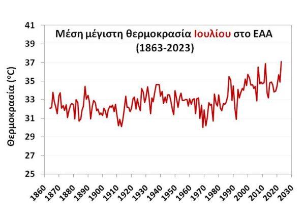 Εντυπωσιακά είναι τα στοιχεία του ιστορικού αρχείου του Εθνικού Αστεροσκοπείου Αθηνών που αναδημοσιεύει ο προγνώστης καιρού της ΕΡΤ, με βάση τα οποία ο Ιούλιος 2023 ήταν ο θερμότερος Ιούλιος και ο θερμότερος μήνας γενικά που έχει καταγραφεί ποτέ τα τελευταία 160 χρόνια στην Αθήνα.