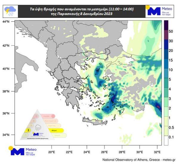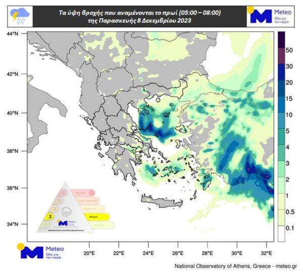 Στους Χάρτες που ακολουθούν παρουσιάζονται τα ύψη βροχής που αναμένονται το πρωί (05:00-08:00) και το μεσημέρι (11:00-14:00) της Παρασκευής 08/12.