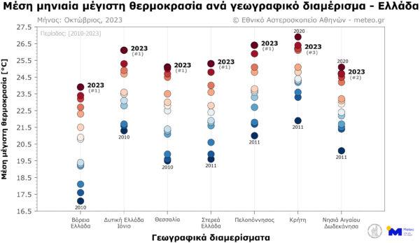Ο φετινός Οκτώβριος χαρακτηρίστηκε από πολλές ημέρες με θετικές αποκλίσεις θερμοκρασίας, και εκτός από τις Κυκλάδες, τα Δωδεκάνησα, και την Κρήτη, ήταν ο πιο θερμός Οκτώβριος από το 2010. Στη Μακεδονία και τη Θράκη καταγράφηκαν οι μεγαλύτερες θετικές αποκλίσεις θερμοκρασίας, με τις μέσες μηνιαίες τιμές να κυμαίνονται 3,5 °C πάνω από τα κανονικά για την εποχή επίπεδα. Εξαιρετικά θερμός ήταν και για τη Θεσσαλία (+2,8 °C), τη Στερεά Ελλάδα, την Ήπειρο, τα Επτάνησα, τη Δυτική Ελλάδα και την Πελοπόννησο (+2,7 °C).