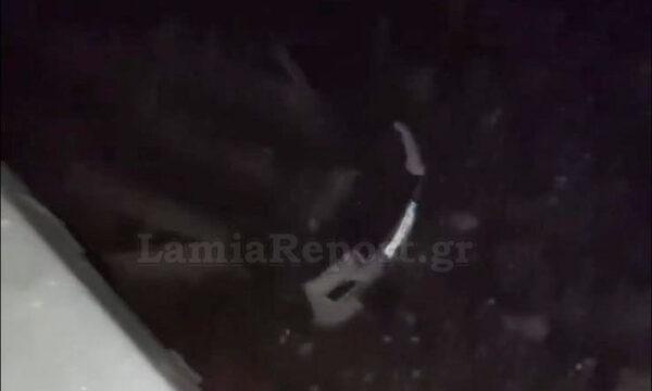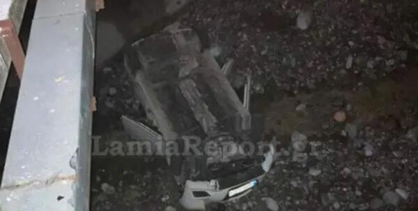 Επιχείρηση με γερανό οργανώθηκε το μεσημέρι της Κυριακής (5/11) για να μπορέσουν να τραβήξουν το αυτοκίνητο από την κοίτη του ρέματος, το οποίο «προσγειώθηκε» ανάποδα κάτω από γέφυρα στη Λαμία