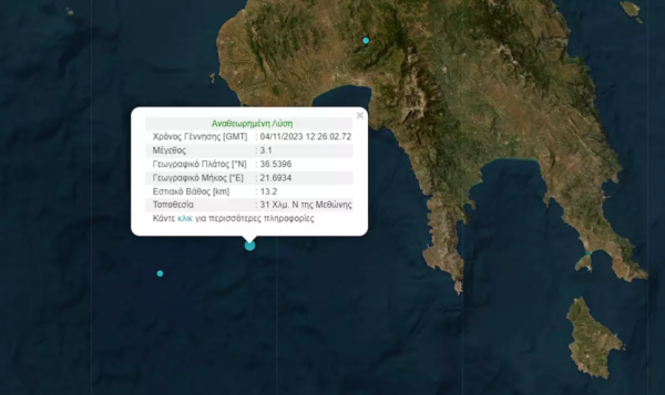 Ο σεισμός μεγέθους 3,1 βαθμών της κλίμακας Ρίχτερ στη Μεσσηνία κοντά στη Μεθώνη έγινε στις 3:26 το μεσημέρι του Σαββάτου, 4 Νοεμβρίου.