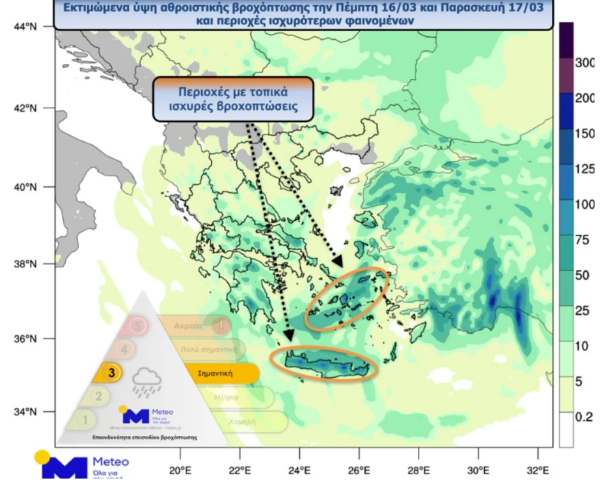 Το παρακάτω γράφημα δείχνει το εκτιμώμενο ύψος αθροιστικής βροχόπτωσης και τις περιοχές ισχυρότερων φαινομένων κατά τη διάρκεια της Πέμπτης 16/03 και της Παρασκευής 17/03.