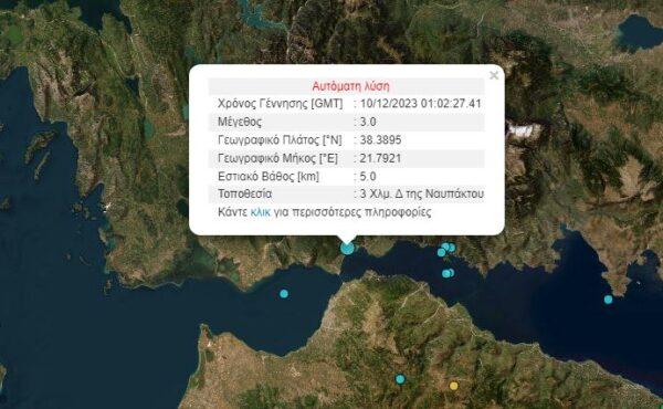 Ένας σεισμός με μέγεθος 3 βαθμών της Κλίμακας Ρίχτερ σημειώθηκε στις 03:02 τα ξημερώματα της Κυριακής (10/12) στη Ναύπακτο.