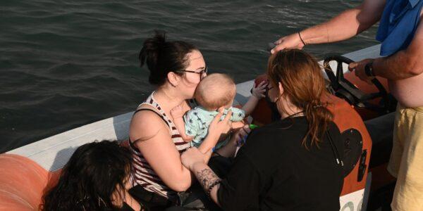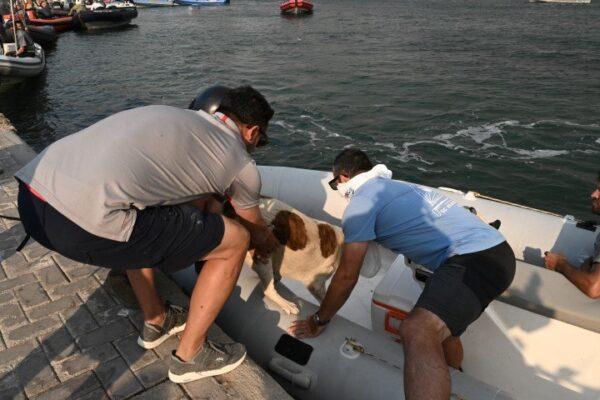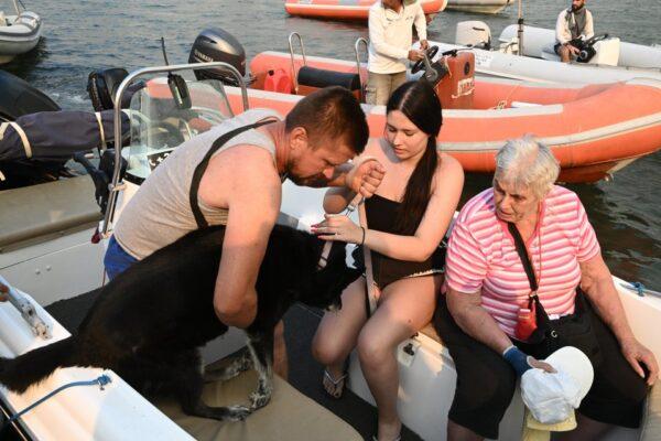Λόγω της επικινδυνότητας, κάτοικοι εγκαταλείπουν το σημείο μέσω θαλάσσης, καθώς επιβιβάζονται σε βάρκες.