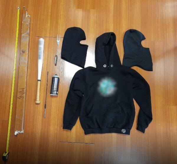 Λίγο αργότερα, οι αστυνομικοί κατάφεραν να ακινητοποιήσουν το ένα από τα δύο αυτοκίνητα και προχώρησαν στην προσαγωγή τριών ατόμων, 16, 19 και 20 ετών, στην κατοχή των οποίων βρέθηκαν και κατασχέθηκαν: ξύλινο στειλιάρι, ξύλινο ρόπαλο, μεταλλική τσιμπίδα, κεραία αυτοκινήτου, δύο κουκούλες τύπου full face, μπλούζα με κουκούλα και σπρέι.