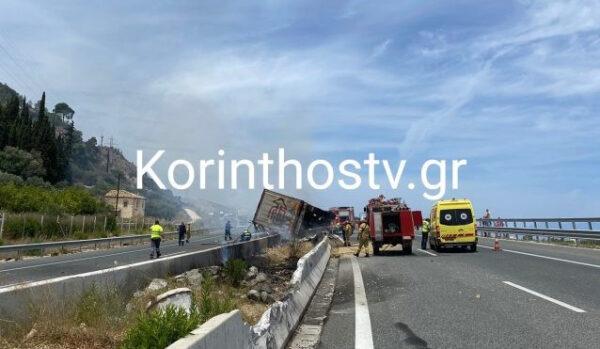 Για άγνωστη αιτία η νταλίκα εξετράπη της πορείας της και ανετράπη και αμέσως το όχημα τυλίχθηκε στις φλόγες, με τη φωτιά να έχει επεκταθεί και στα πρανή της Εθνικής οδού.
