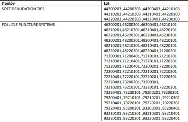 Σχετικά με τα SOFT DENUDATION TIPS και FOLLICLE PUNCTURE SYSTEMS θα ανακληθούν επειδή η ασφάλειά τους δεν επιβεβαιώνεται αποδεδειγμένα κυρίως σε ό,τι έχει να κάνει με την εμβρυοτοξικότητα.