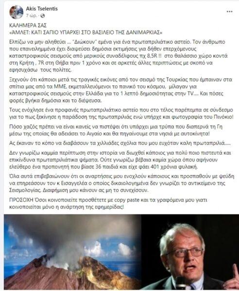Σε ανάρτησή του αργά το βράδυ της Τρίτης, ο κ. Τσελέντης υποστηρίζει μεταξύ άλλων πως “κάποιοι προσπαθούν με ψεύδη να επηρεάσουν τον κ. εισαγγελέα, ο οποίος δικαιολογημένα δεν γνωρίζει το αντικείμενο της σεισμολογίας”.