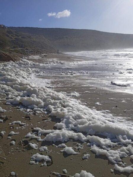 Ο πλούσιος αφρός που ξέβρασαν τα κύματα στην παραλία εμφανίστηκε ιδίως στην παραλία των Ματάλων και τον Κομμό, εντυπωσιάζοντας τους παρατηρητές, σύμφωνα με το cretalive.gr.