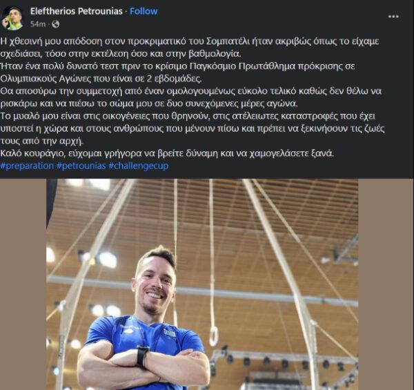 Παρότι κατέκτησε την πρόκριση για τον τελικό των κρίκων, στην πρεμιέρα του παγκόσμιου Τσάλεντζ Καπ ενόργανης γυμναστικής του Σομπατέλι, στην Ουγγαρία, ο Λευτέρης Πετρούνιας, ανακοίνωσε την απόσυρσή του