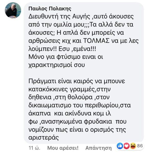 Ο κ. Πολάκης έδωσε συνέχεια στην κόντρα σχολιάζοντας κάτω από την ανάρτηση του διευθυντή της «Αυγής» σε έντονο ύφος.