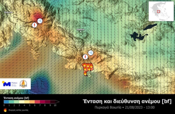 Τα προγνωστικά πολύ υψηλής ανάλυσης της μονάδας METEO του Εθνικού Αστεροσκοπείου Αθηνών δείχνουν ότι στις περιοχές των δασικών πυρκαγιών σε Βοιωτία και Έβρο, οι συνθήκες δε θα είναι καθόλου ευνοϊκές τις επόμενες ώρες μέχρι αργά το βράδυ.