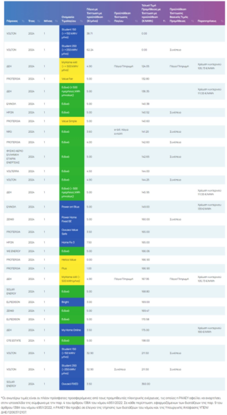 -Ακολουθούν τρία πράσινα τιμολόγια, της ΔΕΗ στα 13,635, της Ελινόιλ στα 14,038 και της Ήρων στα 14,052 σεντς ανά κιλοβατώρα.