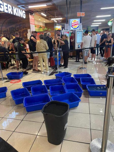 Μια νεροποντή είναι αρκετή για να επιστρατευτούν κουβάδες και σφουγγαρίστρες, με τους τουρίστες ομολογουμένως να είναι σε δίλλημα μήπως και αυτή η μικρή πισίνα είναι στις παροχές του αεροδρομίου.