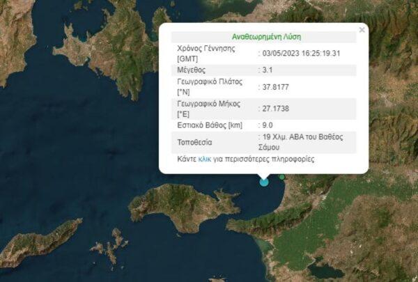 Σεισμός μεγέθους 3,1 βαθμών της κλίμακας Ρίχτερ σημειώθηκε πριν από λίγη ώρα ανοικτά του νησιού της Σάμου.
