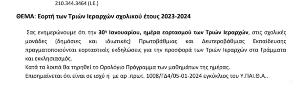 Όπως αναφέρεται στη σχετική εγκύκλιο: “Σας ενημερώνουμε ότι την 30η Ιανουαρίου, ημέρα εορτασμού των Τριών Ιεραρχών, στις σχολικές μονάδες (δημόσιες και ιδιωτικές) Πρωτοβάθμιας και Δευτεροβάθμιας Εκπαίδευσης πραγματοποιούνται εορταστικές εκδηλώσεις για την προσφορά των Τριών Ιεραρχών στα Γράμματα και εκκλησιασμός. Κατά τα λοιπά θα τηρηθεί το Ωρολόγιο Πρόγραμμα των μαθημάτων της ημέρας”.