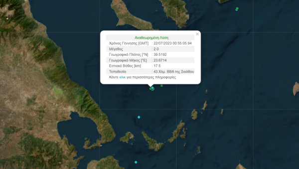 Σύμφωνα με το Γεωδυναμικό Ινστιτούτο, η δόνηση των 3,4 Ρίχτερ καταγράφηκε στις 3:44 τα ξημερώματα του Σαββάτου (22/07), στα 43 χιλιόμετρα βόρεια, βορειοανατολικά της Σκιάθου.